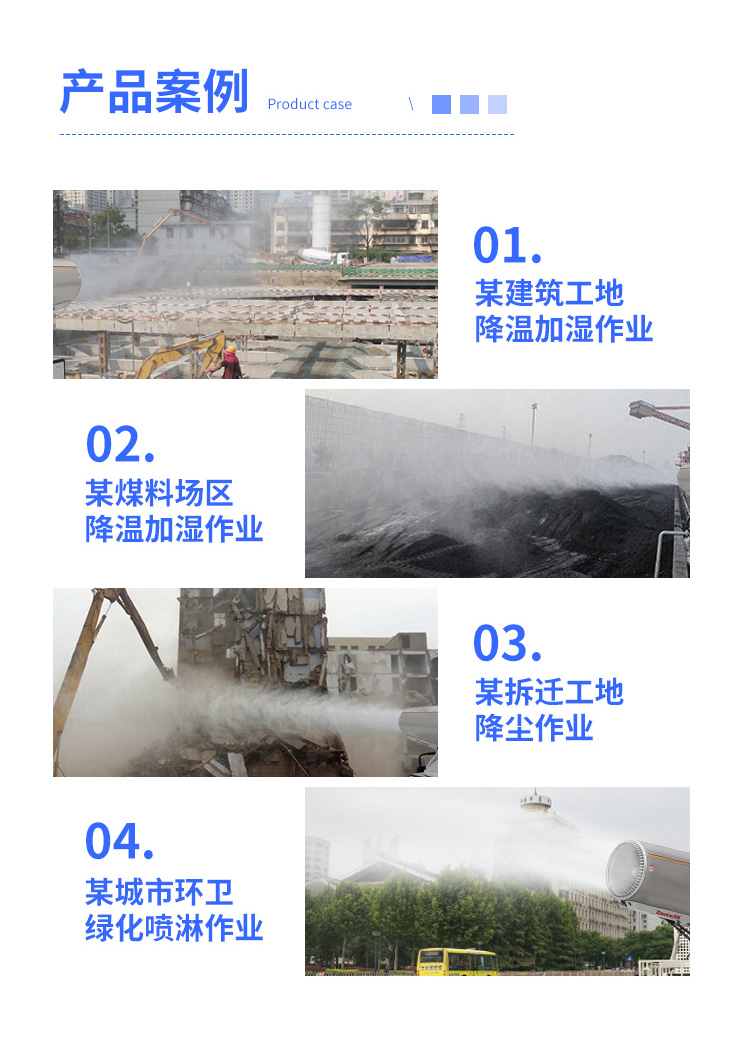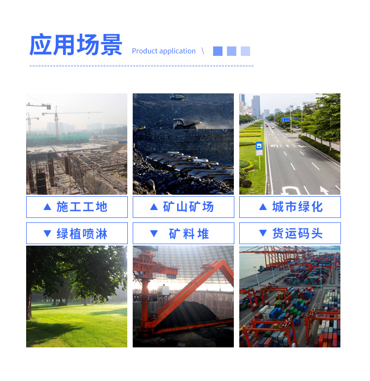 主要用途:用于煤礦場、城市拆遷工地、冶金鋼鐵企業(yè)、采礦區(qū)域、煤化工企業(yè)、水泥廠、火力發(fā)電廠、物料和礦產(chǎn)品露天堆放廠、混凝土處理廠、垃圾堆放場、垃圾焚燒廠、沙廠、干式物料倉庫、露天爆破、重度粉塵區(qū)域。