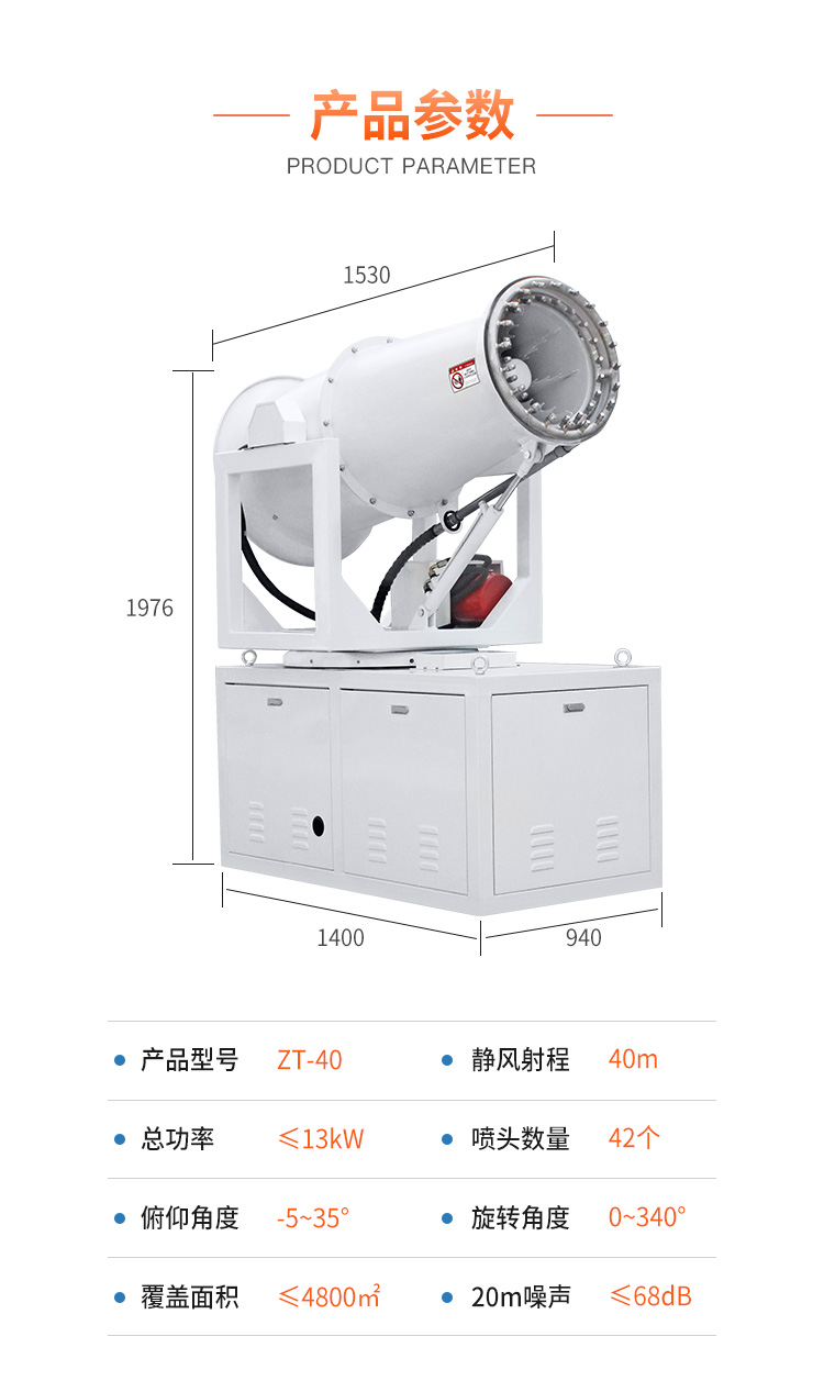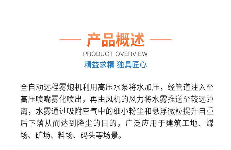 產(chǎn)品特點:40米全自動霧炮機運行平穩(wěn),支持只能操控,可放置一處實現(xiàn)全自動噴霧,霧化細密。