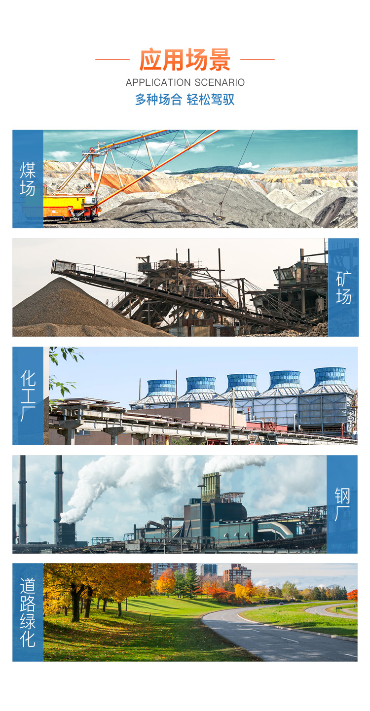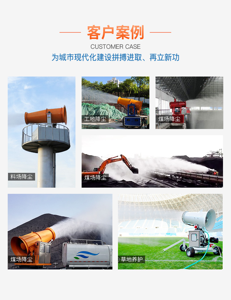 主要用途:建筑工地 煤場,工業(yè)除塵,農(nóng)業(yè),園林綠化等飛機場、高速公路、車站、碼頭、公共場所、運動場地、炎熱場地等降塵保濕降溫消毒。