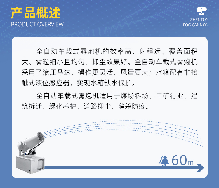 產品特點:60米全自動霧炮機的效率高、射程遠、覆蓋面積大、霧粒細小且均勻、抑塵效果好。采用了液壓馬達,操作更靈活、風量更大;水箱配有非接觸式液位感應器,實現水箱缺水保護。
