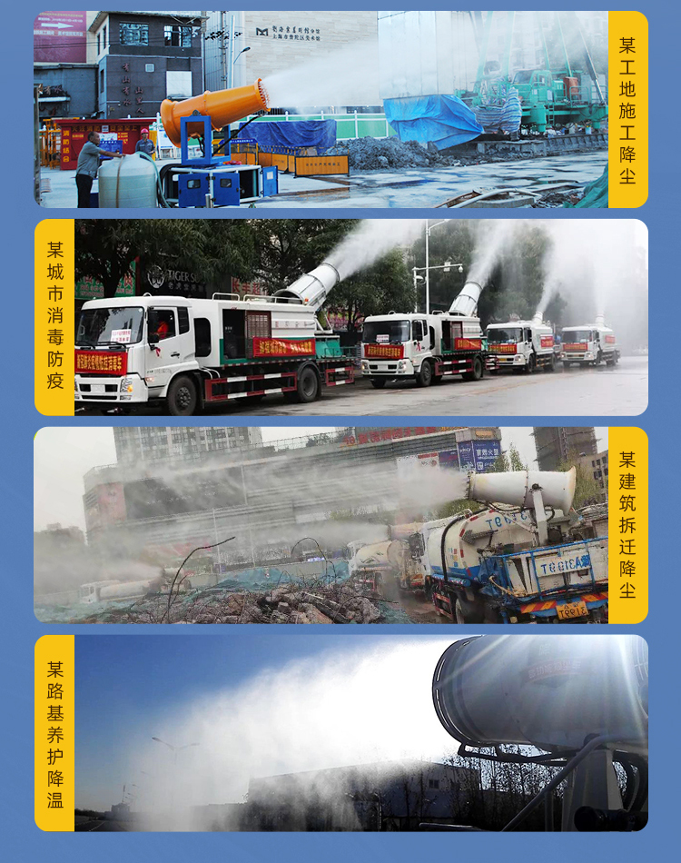 主要用途:建筑工地 煤場,工業除塵,農業,園林綠化等飛機場、高速公路、車站、碼頭、公共場所、運動場地、炎熱場地等降塵保濕降溫消毒。
