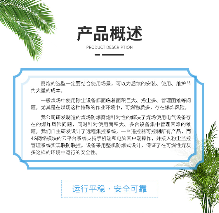 產品特點:100米煤場防爆霧炮機采用立式結構,工作穩定,并且全部都采用了軟啟動的裝置,讓設備在工作的時候能夠正常穩定的發揮,采用1000米遠程遙控,機身攜帶大功率信號接收器,可在更遠的距離對機器設置起停,自動供水,自動噴霧,自動旋轉,自動俯仰,也可采用定時噴霧,定點噴霧等更智能的操作模式。