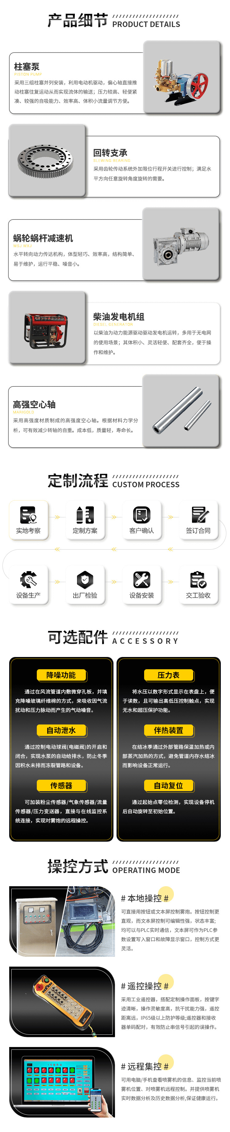 主要用途:建筑工地 煤場,礦場、料場、碼頭工業除塵,農業,園林綠化等飛機場、高速公路、車站、碼頭、公共場所、運動場地、炎熱場地等降塵保濕降溫消毒。
