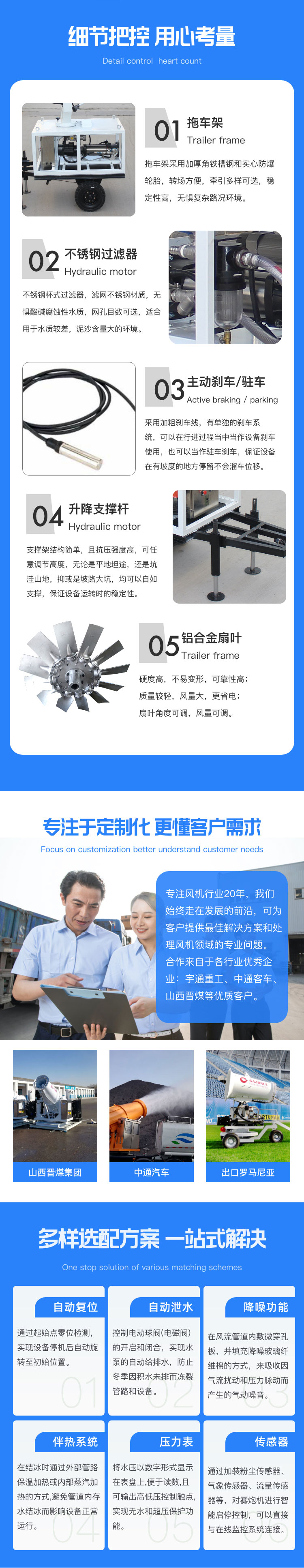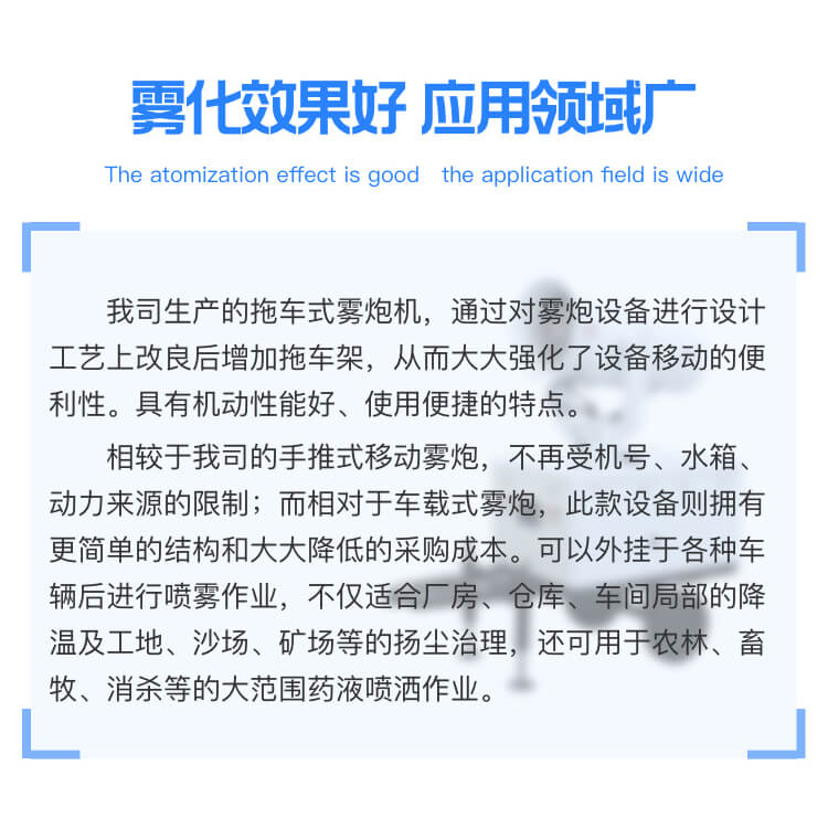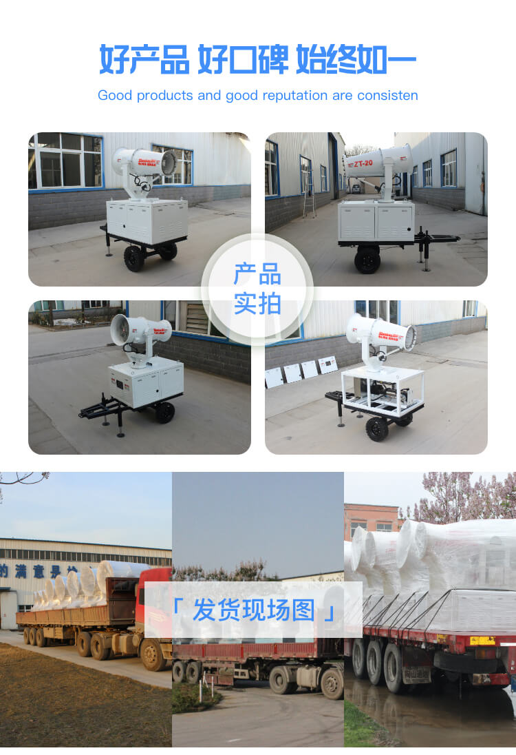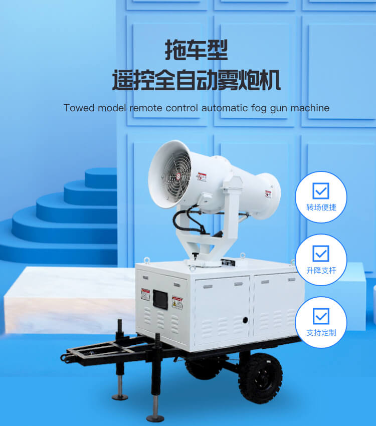 產品特點:牽引式遙控全自動霧炮機射程遠、機動性能好、使用便捷,支持遙控和人工控制操作。