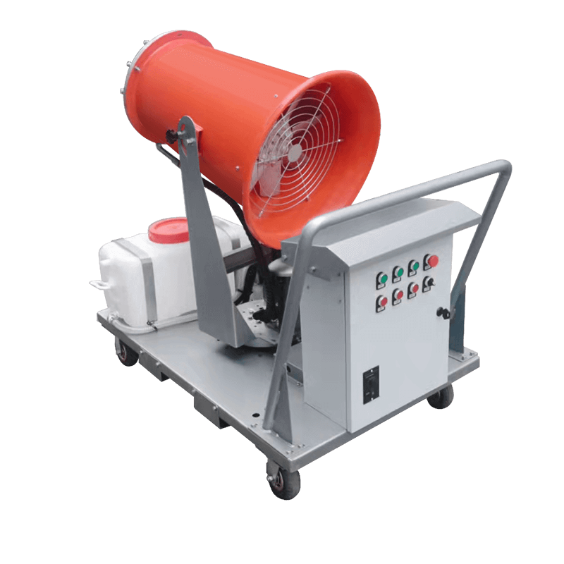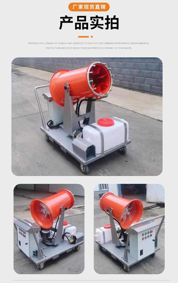 產品特點:手推移動式霧炮機降塵速度快、機結構緊湊、布局合理、移動靈活、構造簡單易維護。