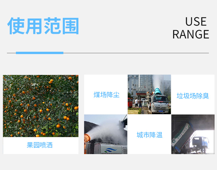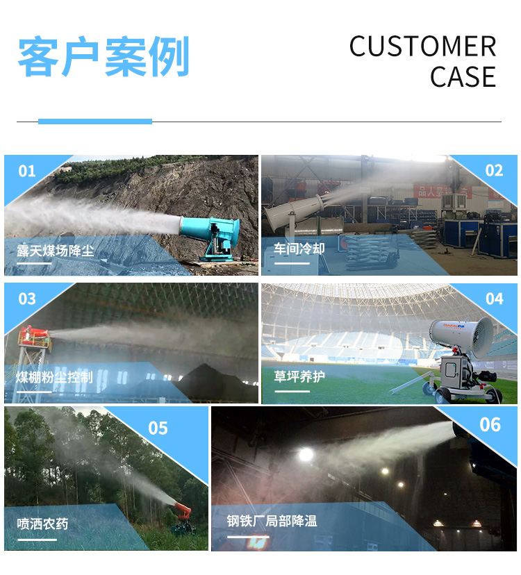 主要用途:適用于城市拆遷工地、冶金鋼鐵企業、采礦區域、煤化工企業、水泥廠、火力發電廠、建筑工地、物料和礦產品露天堆放廠、混凝土處理廠、垃圾堆放場、垃圾焚燒廠、沙廠、干式物料倉庫、露天爆破、重度粉塵區域。