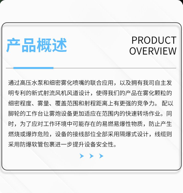 產品特點:移動式噴霧風機這款產品具有一鍵啟動功能,能起到快速降塵、降溫的作用;移動便捷,方便維修。