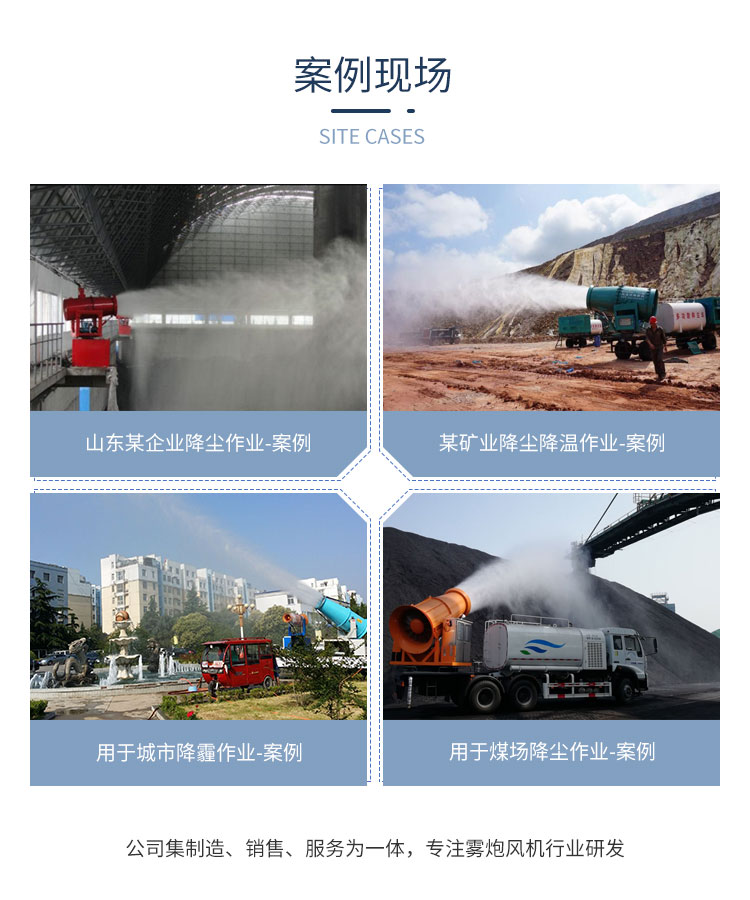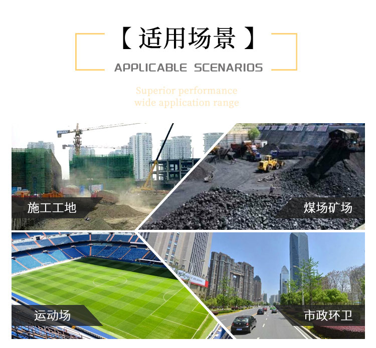 主要用途:用于煤礦場、城市拆遷工地、冶金鋼鐵企業、采礦區域、煤化工企業、水泥廠、火力發電廠、物料和礦產品露天堆放廠、混凝土處理廠、垃圾堆放場、垃圾焚燒廠、沙廠、干式物料倉庫、露天爆破、重度粉塵區域。