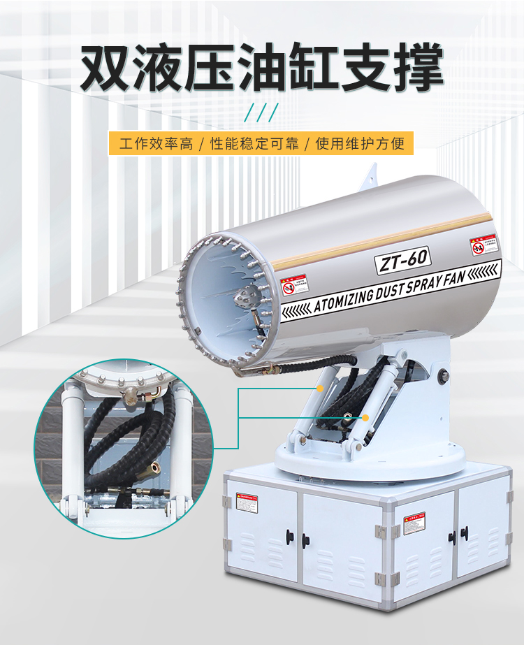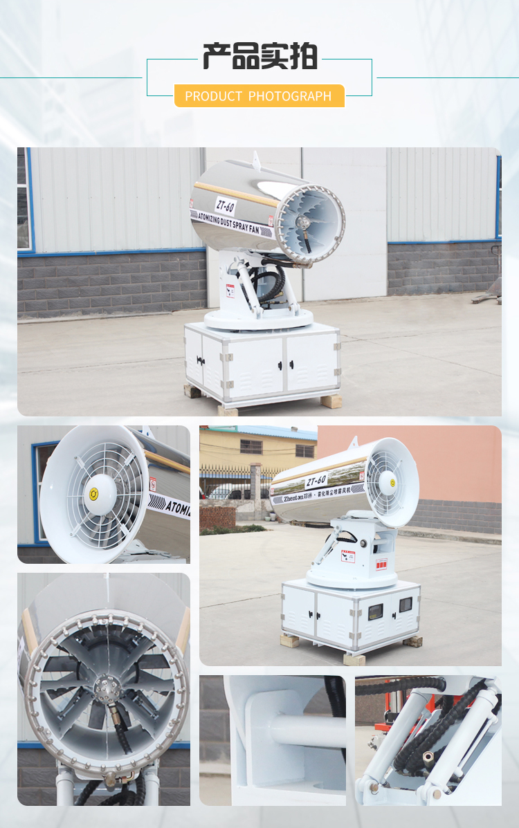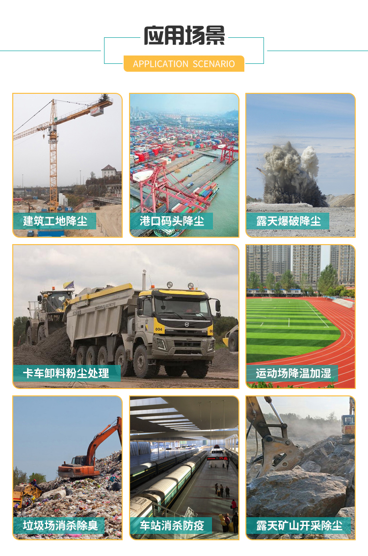 主要用途:用于煤礦場、城市拆遷工地、冶金鋼鐵企業、采礦區域、煤化工企業、水泥廠、火力發電廠、物料和礦產品露天堆放廠、混凝土處理廠、垃圾堆放場、垃圾焚燒廠、沙廠、干式物料倉庫、露天爆破、重度粉塵區域。