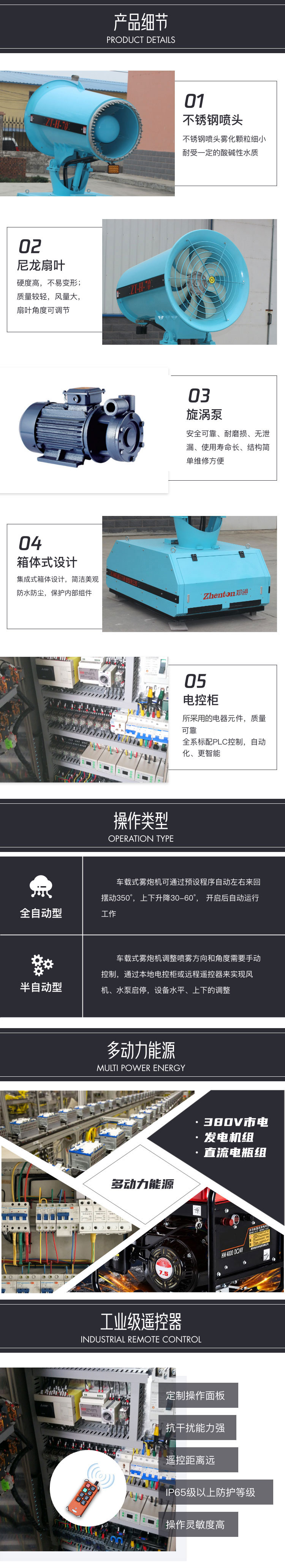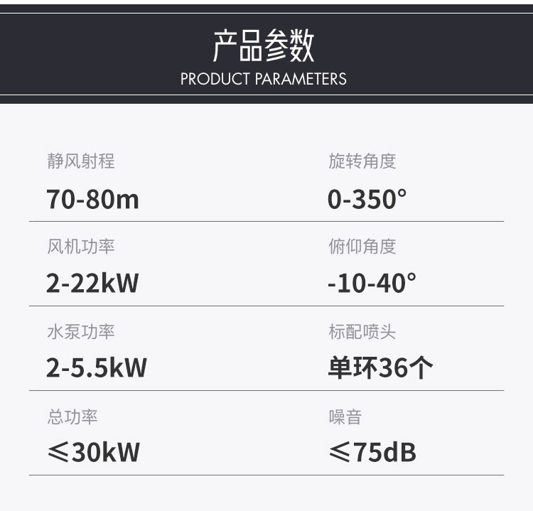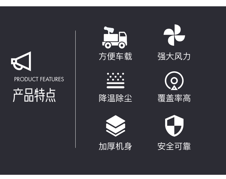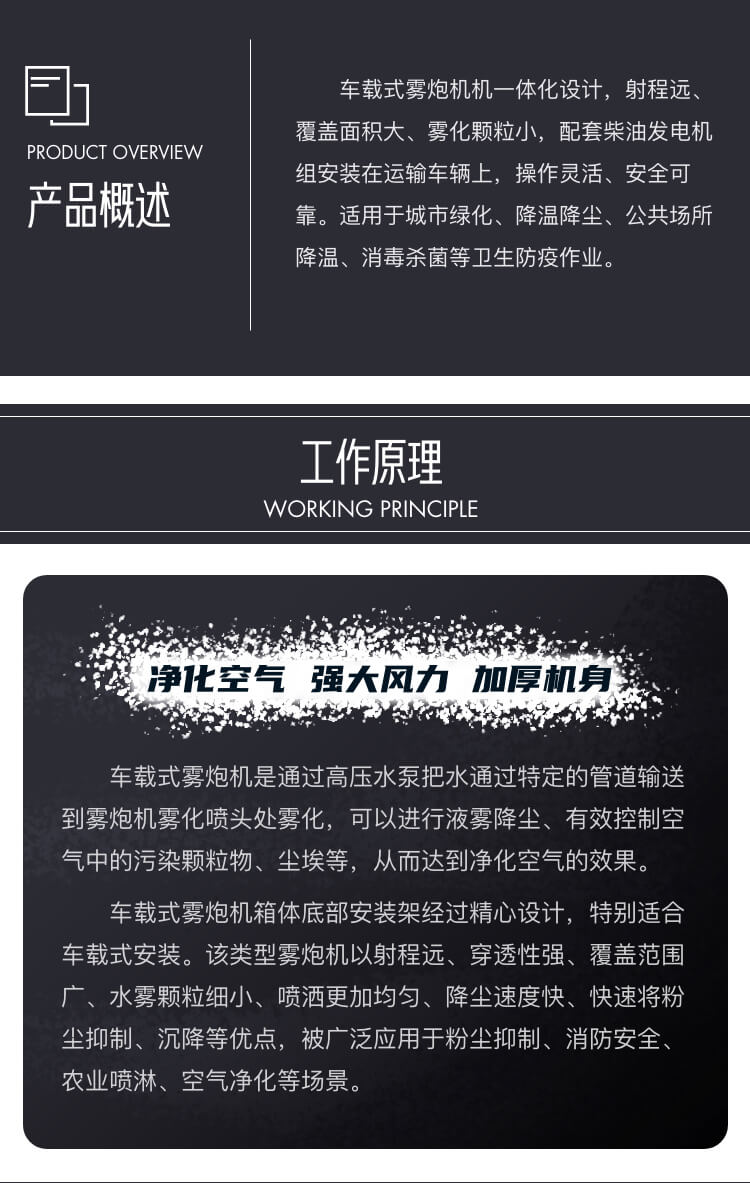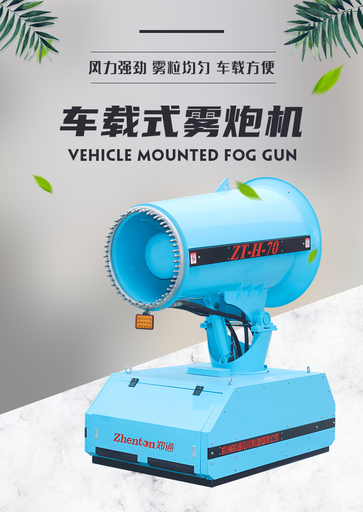 產品特點:車載式70米遠程霧炮機一體化設計,射程遠、覆蓋面積大、霧化顆粒小,配套柴油發電機組安裝在運輸車輛上,操作靈活、安全可靠。