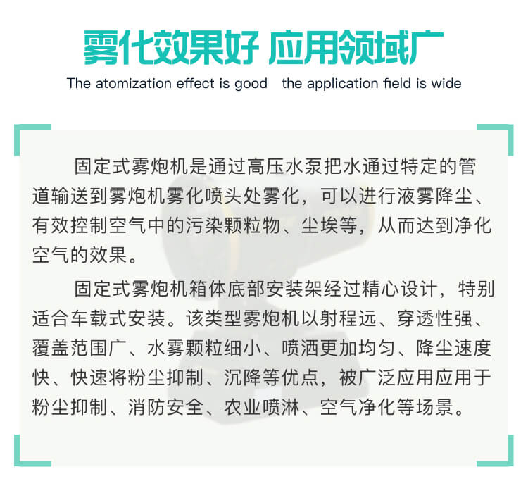 產品特點:100米全自動霧炮機射程遠、覆蓋范圍廣、工作效率高、可以實現精量噴霧;配套動力靈活,使用安全可靠。