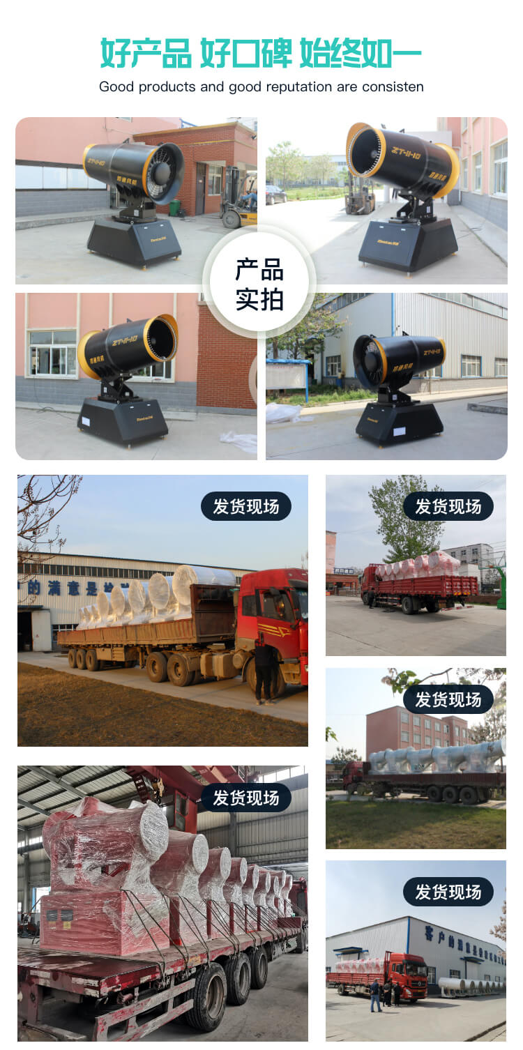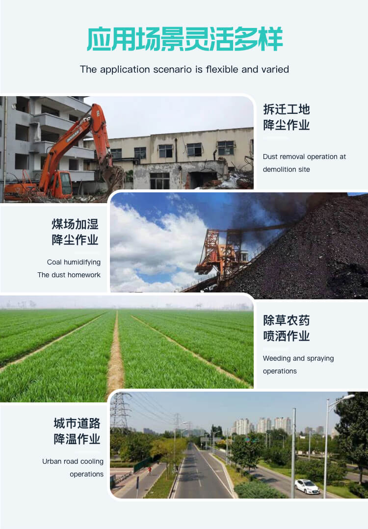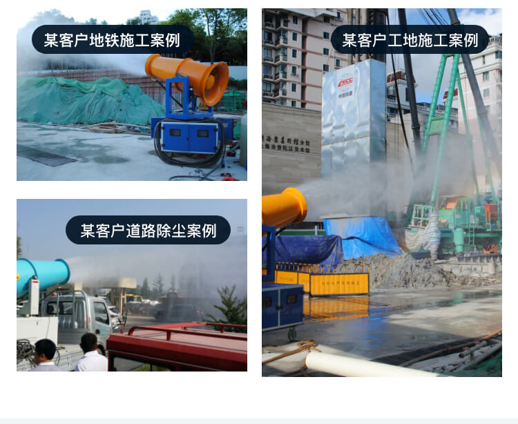 主要用途:用于煤礦場、城市拆遷工地、冶金鋼鐵企業、采礦區域、煤化工企業、水泥廠、火力發電廠、物料和礦產品露天堆放廠、混凝土處理廠、垃圾堆放場、垃圾焚燒廠、沙廠、干式物料倉庫、露天爆破、重度粉塵區域。