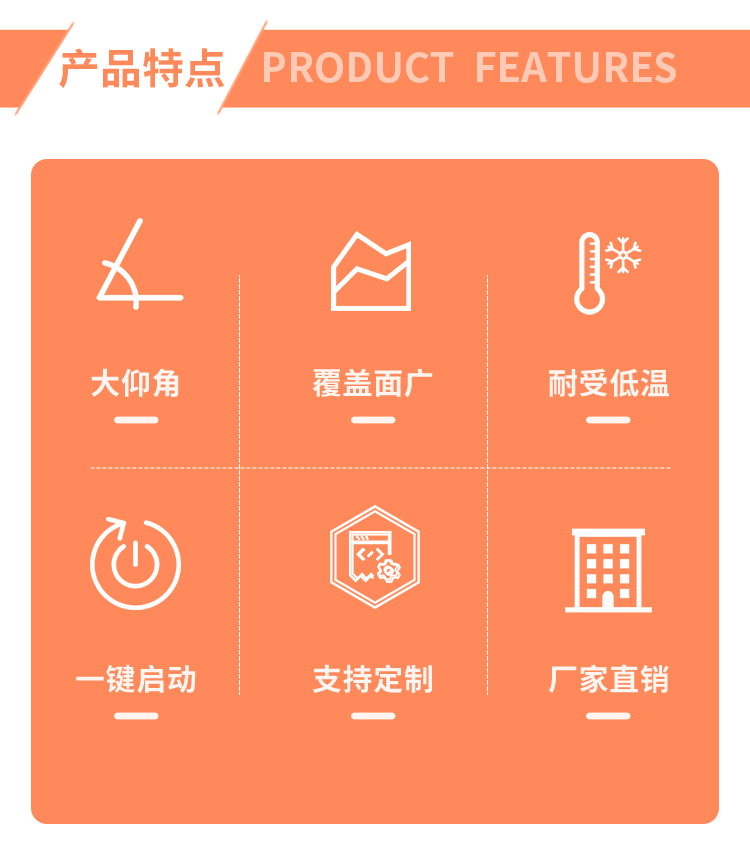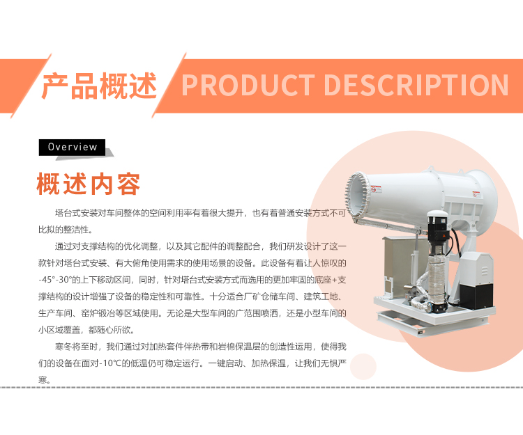 產品特點:塔臺式大仰角霧炮機有著讓人驚嘆的-45-30度的上下移動區間,同時,針對塔臺式安裝方式而確定的更加牢固的底座+支撐結構的設計增強了設備的穩定性和可靠性。