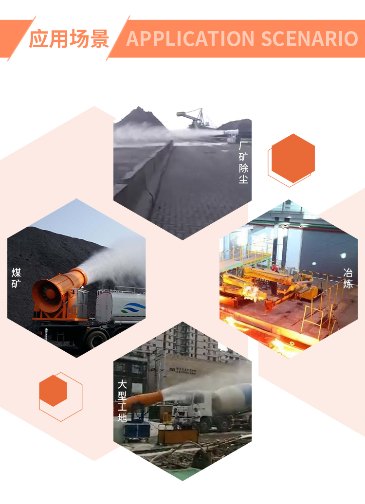 主要用途:適用于城市拆遷工地、冶金鋼鐵企業、采礦區域、煤化工企業、水泥廠、火力發電廠、建筑工地、物料和礦產品露天堆放廠、混凝土處理廠、垃圾堆放場、垃圾焚燒廠、沙廠、干式物料倉庫、露天爆破、重度粉塵區域。