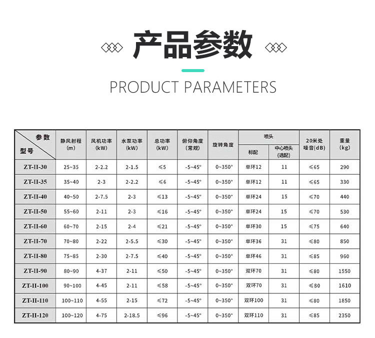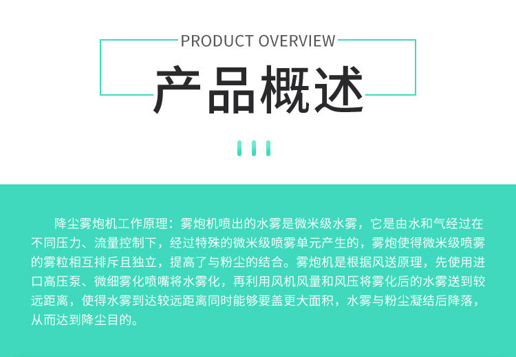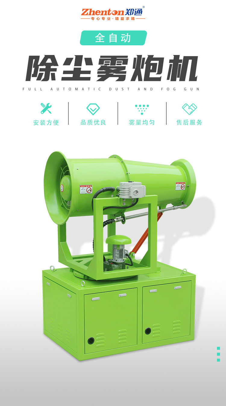 產品特點:大仰角霧炮機采用箱體式結構,安裝方便;除塵效果好,覆蓋范圍廣,工作效率高。
