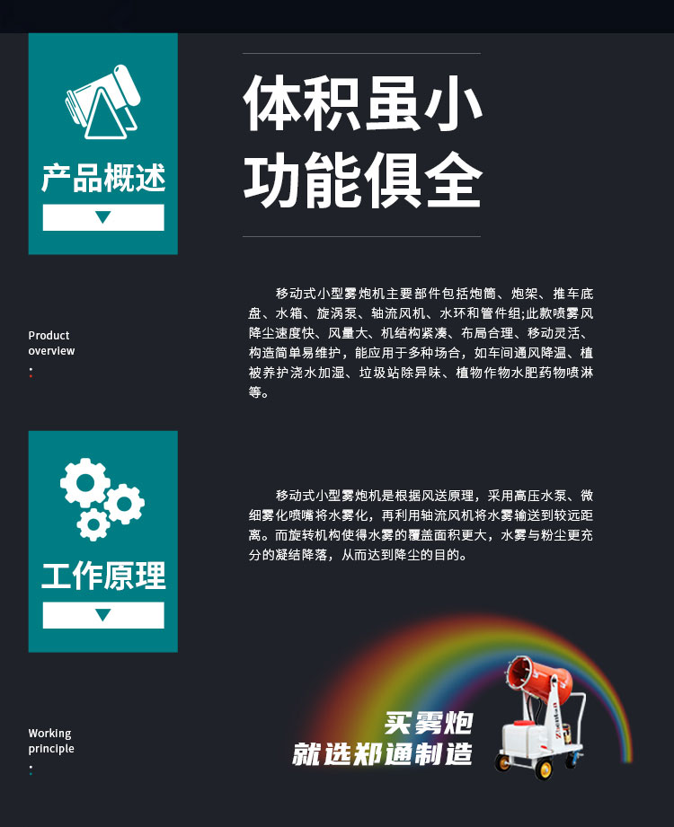 果園移動式小型噴霧機降塵速度快、風量大、機結構緊湊、布局合理、移動靈活、構造簡單易維護。