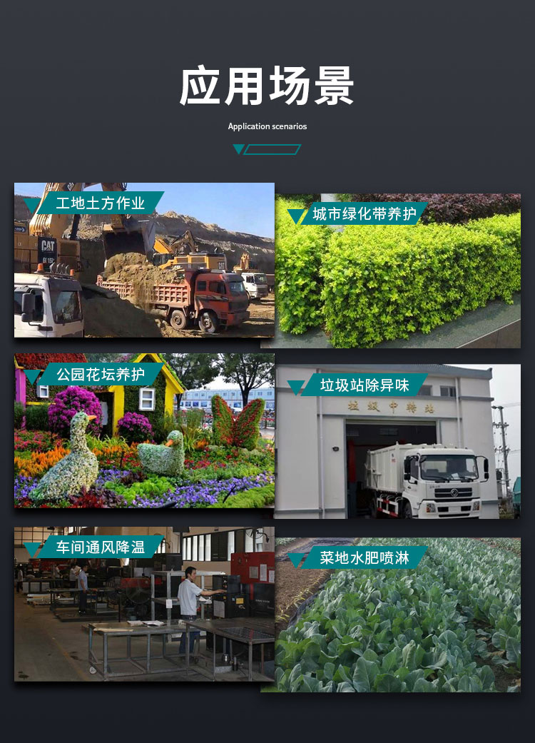 車間通風降溫、植被養護澆水加濕、垃圾站除異味、植物作物水肥藥物噴淋等。
