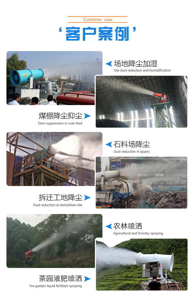 主要用途:用于煤礦場(chǎng)、城市拆遷工地、冶金鋼鐵企業(yè)、采礦區(qū)域、煤化工企業(yè)、水泥廠、火力發(fā)電廠、物料和礦產(chǎn)品露天堆放廠、混凝土處理廠、垃圾堆放場(chǎng)、垃圾焚燒廠、沙廠、干式物料倉(cāng)庫(kù)、露天爆破、重度粉塵區(qū)域。