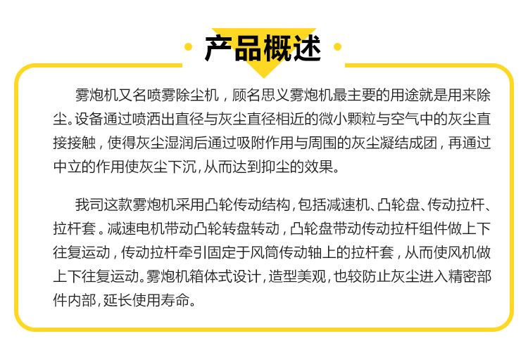 主要用途:用于煤礦場、城市拆遷工地、冶金鋼鐵企業、采礦區域、煤化工企業、水泥廠、火力發電廠、物料和礦產品露天堆放廠、混凝土處理廠、垃圾堆放場、垃圾焚燒廠、沙廠、干式物料倉庫、露天爆破、重度粉塵區域。