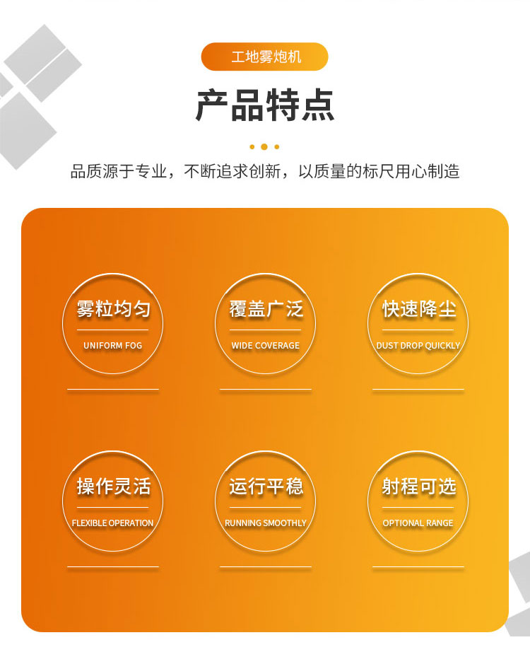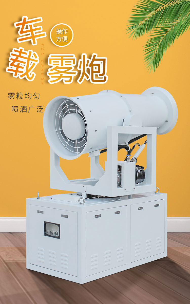 產品特點:工地車載式霧炮機利用高壓將水霧化,噴出的水霧極細,隨風散落絲毫不會噴濕衣服,也不會使地面過濕而泥濘不堪;水霧越細小,反而越容易吸附細顆粒物,且每小時耗水量少,比灑水車更省水。