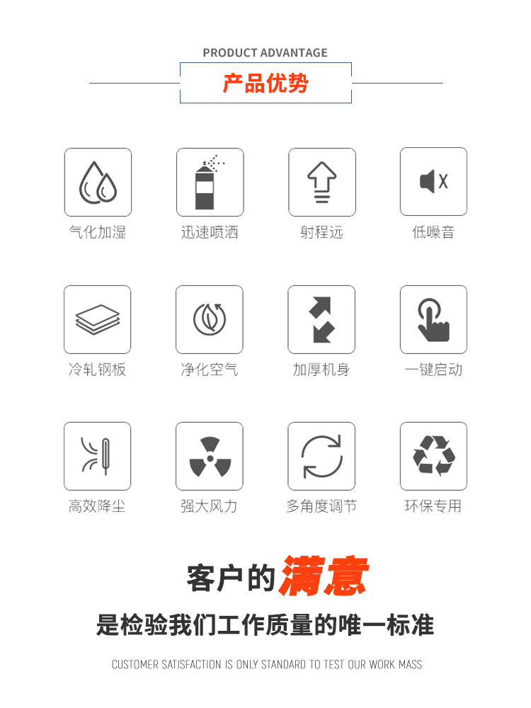 產品特點:50米市政降塵霧炮機射程遠、覆蓋范圍廣、工作效率高、可以實現精量噴霧;噴出的霧粒細小,能快速將粉塵抑制;配套動力靈活,使用安全可靠。