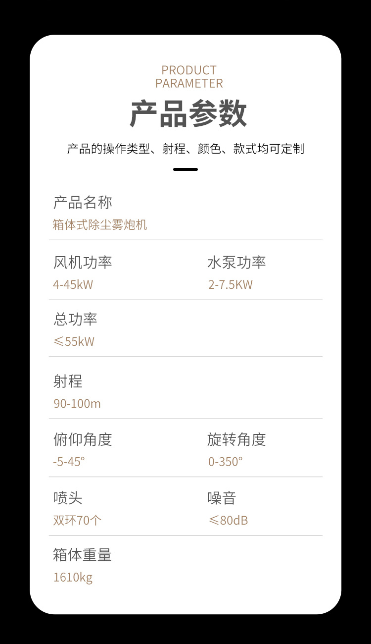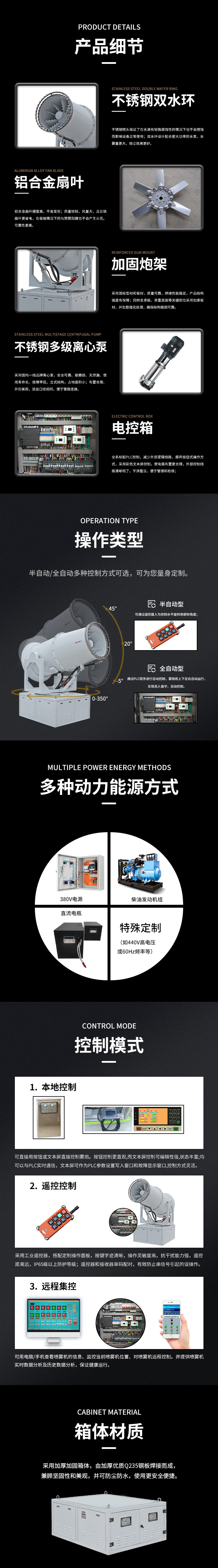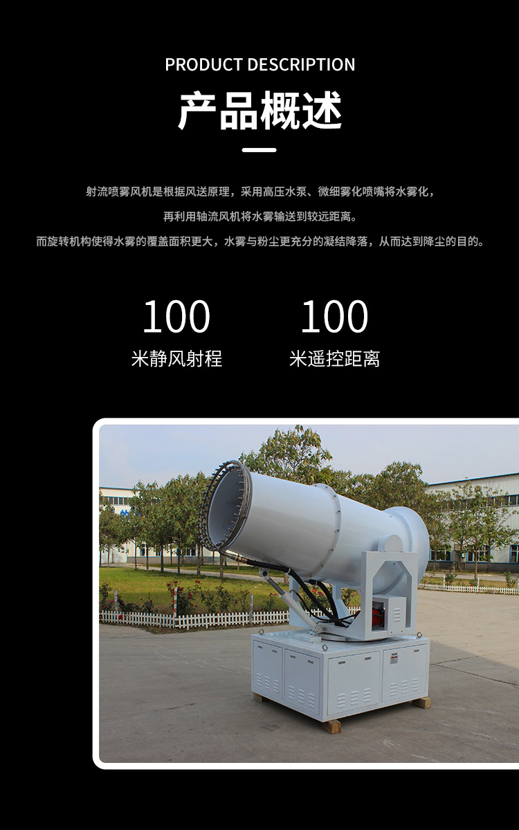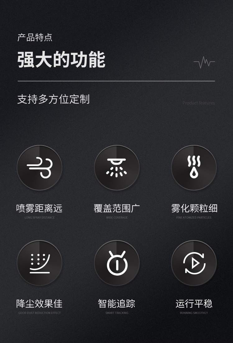 產(chǎn)品特點:100米雙水箱霧炮機(jī)噴霧距離遠(yuǎn)、覆蓋范圍廣、霧化顆粒細(xì)、降塵效果佳、運行平穩(wěn)使用安全可靠。