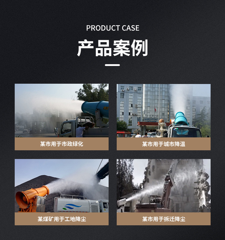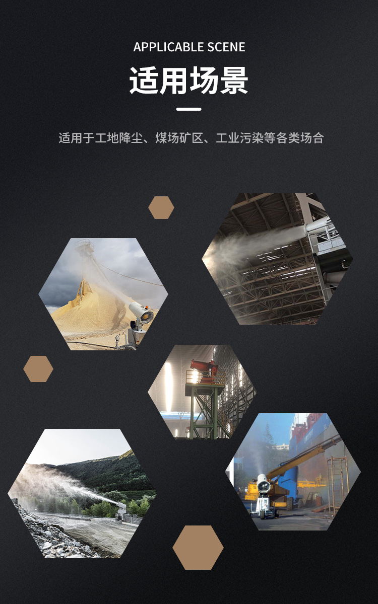 主要用途:用于煤礦場、城市拆遷工地、冶金鋼鐵企業(yè)、采礦區(qū)域、煤化工企業(yè)、水泥廠、火力發(fā)電廠、物料和礦產(chǎn)品露天堆放廠、混凝土處理廠、垃圾堆放場、垃圾焚燒廠、沙廠、干式物料倉庫、露天爆破、重度粉塵區(qū)域。