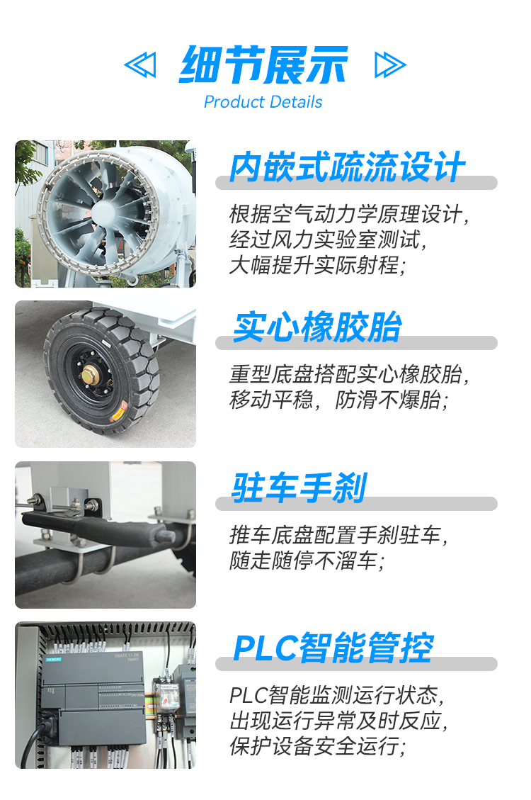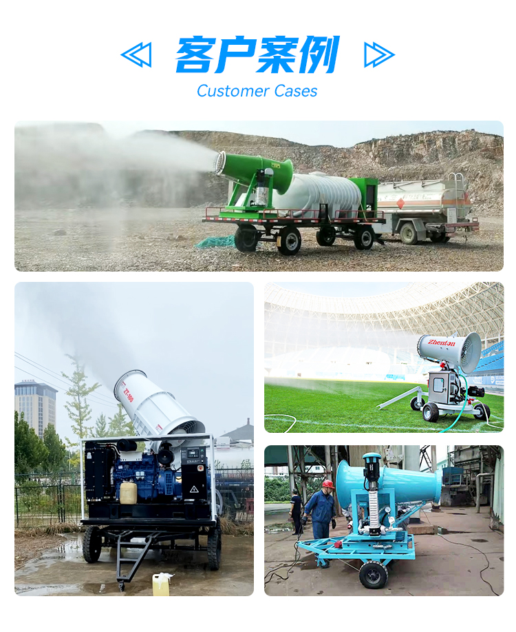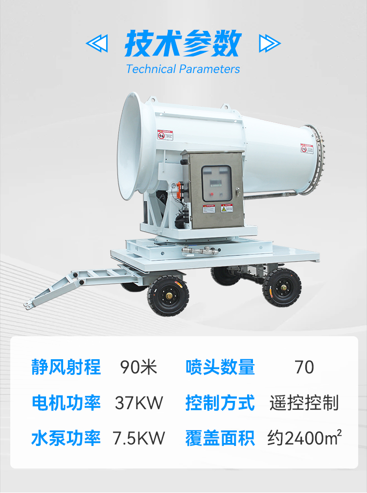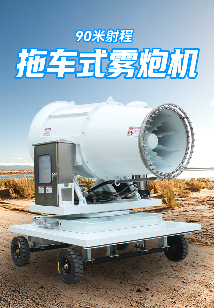 產品特點:90米拖車式霧炮機采用四輪牽引設計,移動性強、動力強、射程遠、覆蓋廣泛、可實現精量噴霧;工作效能高、噴霧加濕更快,能迅速降溫抑塵;配件驅動可靈活定制,操作便捷,靈活方便。