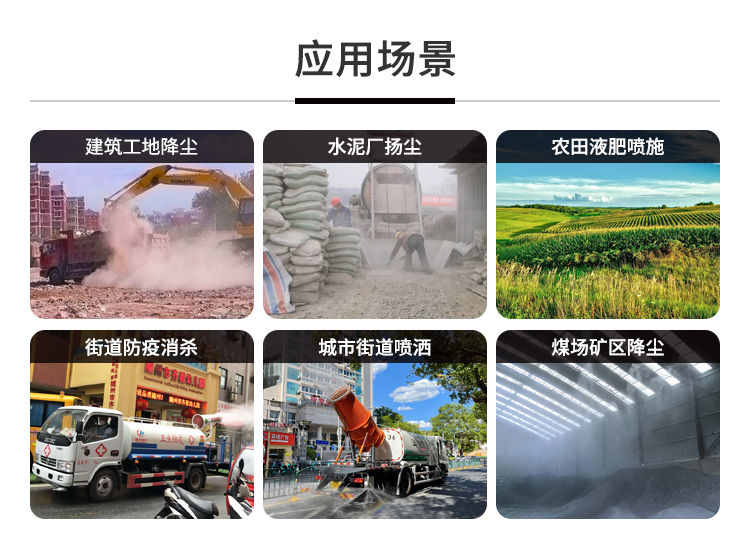 主要用途:建筑工地降塵,水泥廠揚塵,農田打藥,消毒噴灑,城市道路降塵降溫,煤場礦區除塵等場景降塵使用。