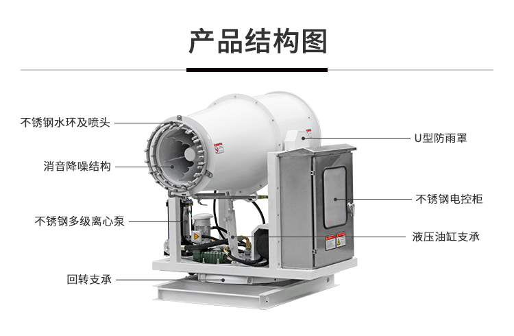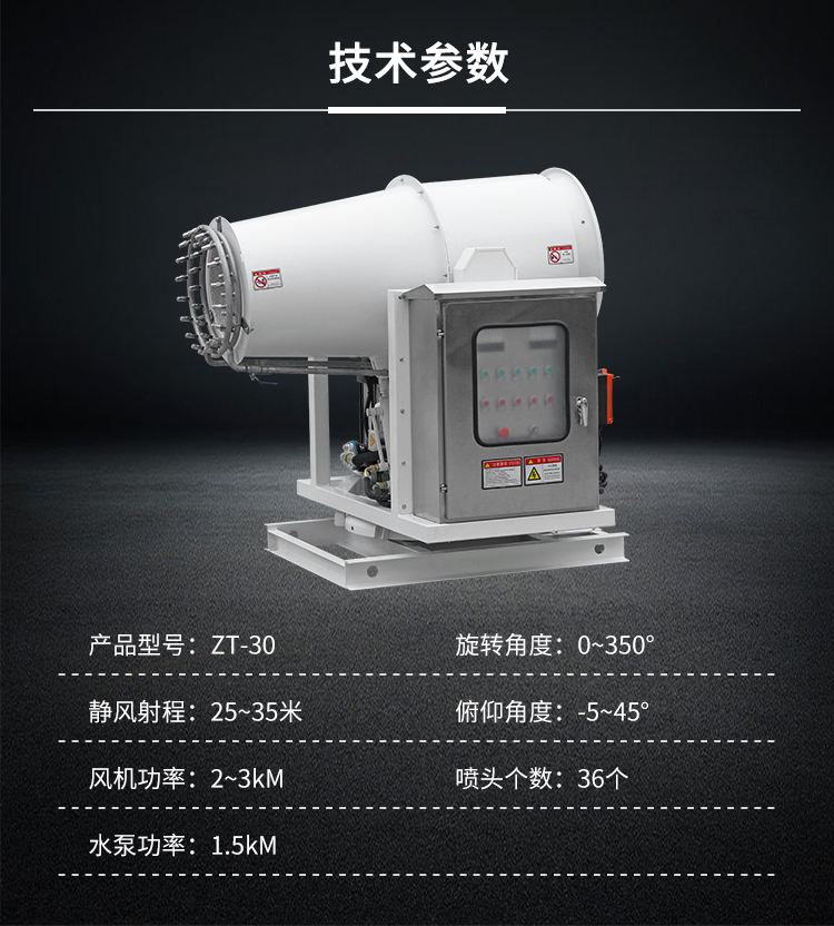 產品特點:這款30米低噪音霧炮機,靜風射程25-35米,是鄭通霧炮機廠家生產,具有噪音低,噴霧范圍廣,霧化細等特點,由不銹鋼多級離心泵,不銹鋼電控箱,液壓油缸支撐以及不銹鋼水環及噴頭組成,采用最新消音降噪結構。在建筑工地降塵,水泥廠揚塵,農田打藥,消毒噴灑,城市道路降塵降溫,煤場礦區除塵等場景備受歡迎!